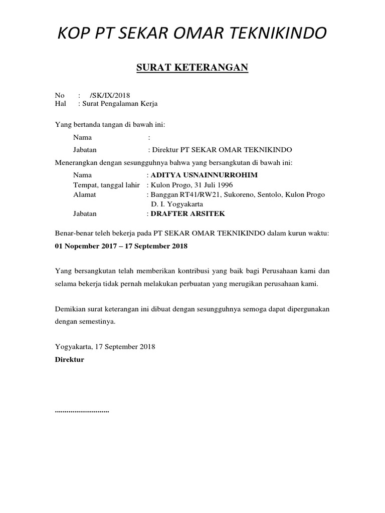 Di sini, kamu bisa mempelajari berbagai contoh surat pengalaman kerja yang bisa kamu gunakan untuk keperluan melamar kerja atau untuk keperluan lainnya. Ketika melamar suatu pekerjaan baru, salah satu hal yang menjadi pertimbangan untuk anda bisa diterima adalah pengalaman surat pengalaman kerja tidak dapat diterbitkan oleh sembarangan orang atau instansi, yang berhak. Jalan susilo sudarman no 9 jakarta pusat. Oleh karena itu, penting bagi pimpinan atau bagian personalia, untuk memahami apa itu surat pengalaman kerja dan berbagai fungsinya. Sebagian orang memilih untuk membuka usaha sendiri dan mendapatkan penghasilan dari sana.