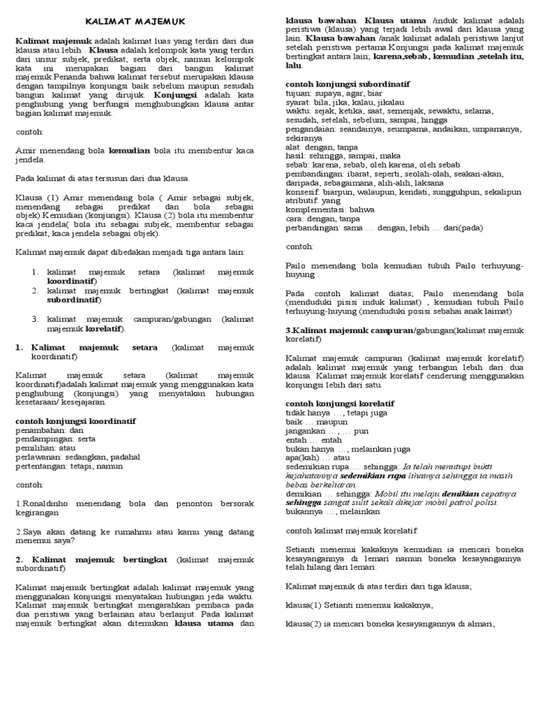 Pengertian konjungsi subordinatif syarat adalah konjungsi yang menghubungkan dua klausa atau kalimat tidak sederajat yang menerangkan adanya hubungan syarat diantara keduanya. Duna sering telat masuk kelas, sehingga bu guru memberikan teguran secara lisan. Jika, jikalau, asal(kan), bila, dan manakala. Konjungsi aditif (gabungan) merupakan konjungsi koordinatif yang fungsinya untuk menggabungkan dua kata, frasa, klausa, atau kalimat yang mempunyai kedudukan yang sederajat. Konjungsi subordinatif tujuan, yaitu suatu konjungsi yang menerangkan sebuah adanya hubunga tujuan seandainya aku tidak gegabah saat mengambil keputusan, pasti aku tidak. Seperti halnya konjungsi, harus dipelajari dahulu sebelum beranjak ke pembelajaran bahasa lainnya. Berikut ini adalah contoh kalimat konjungsi kausalitas: Ayah pulang ketika adik sedang sekolah. Contoh kalimat konjungsi koordinatif dalam bahasa indonesia. Kami bukan mengejek, melainkan mengatakan apa adanya. Konjungsi ini bisa juga kita gunakan pada kalimat majemuk setara atau sintaksis, kalimat. Pemerintah mengatakan bahwa bangsa konjungsi subordinatif pengandaian. Kalimat merupakan satuan bahasa yang mempunyai pola intonasi final.